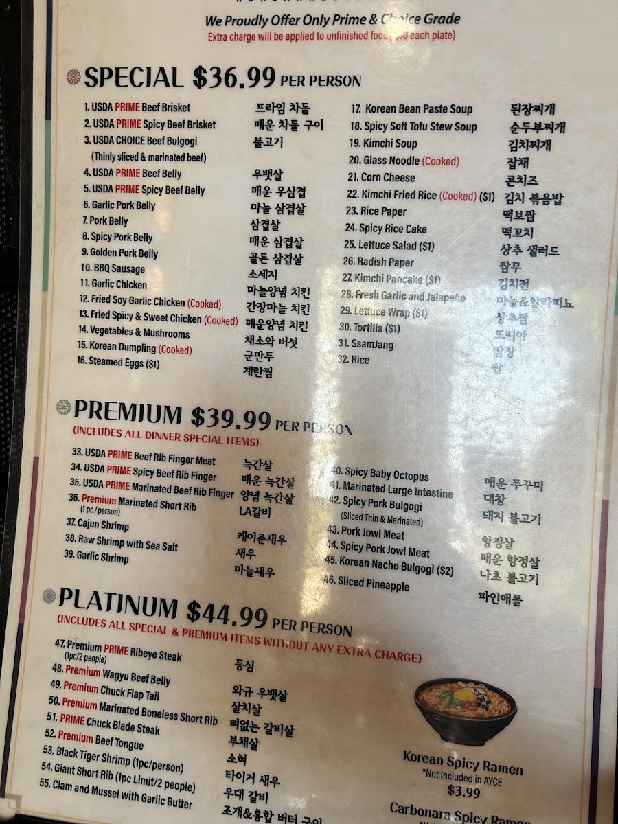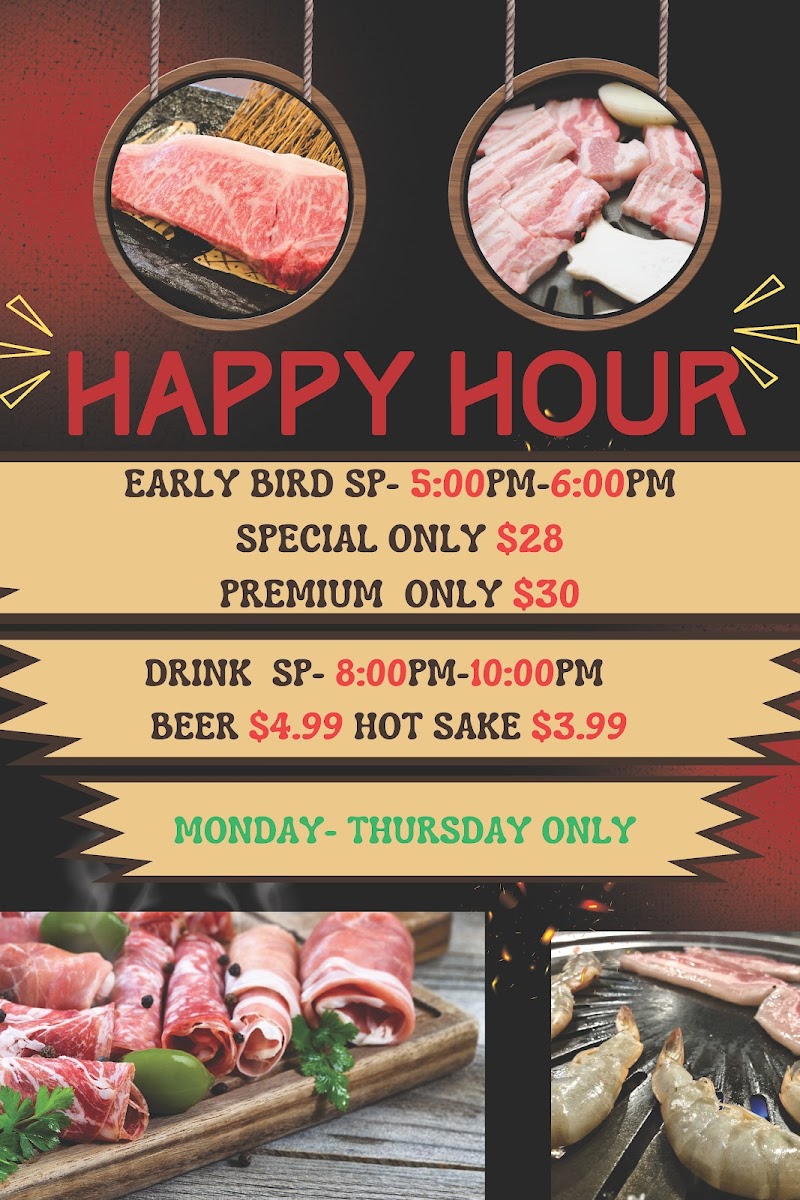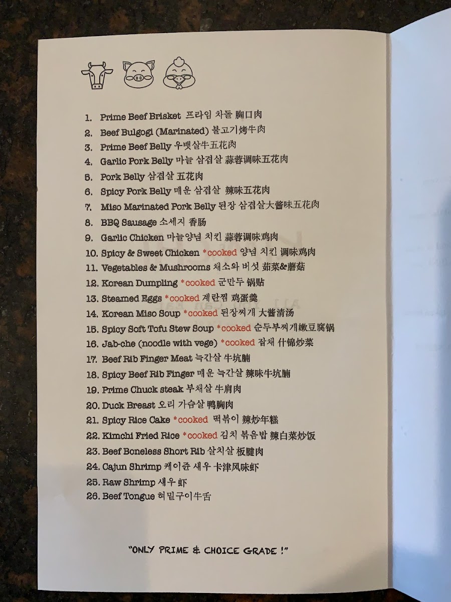 This menu is structured primarily around Korean barbecue items with an emphasis on grilled meats and complementing sides, providing a casual dining experience where guests cook their food tableside. The offerings support a range of dining occasions, from quick orders served promptly to more leisurely meals focused on interactive cooking.