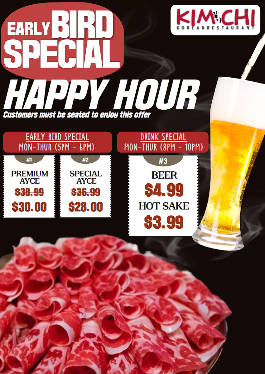 The menu at Kimchi Korean BBQ offers a variety of traditional Korean barbecue dishes and accompanying sides. Visitors can expect selections including Korean BBQ meats such as Waygu, Bulgogi, Pork Belly, and Beef Belly, which are typically grilled at the table. The menu also features Banchan Korean side dishes, seafood, and other hot options like Sizzling Beef, Japchae, Drunken Noodles, Glass Noodles with Beef Bulgogi, and Spicy Tofu Soup with brisket.